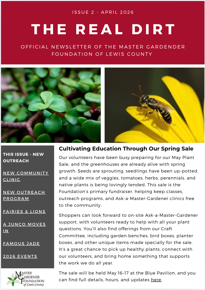 The Real Dirt is the official newsletter of the Lewis County Master Gardener Foundation. April’s newsletter is full of information about a few of the extension outreach programs!